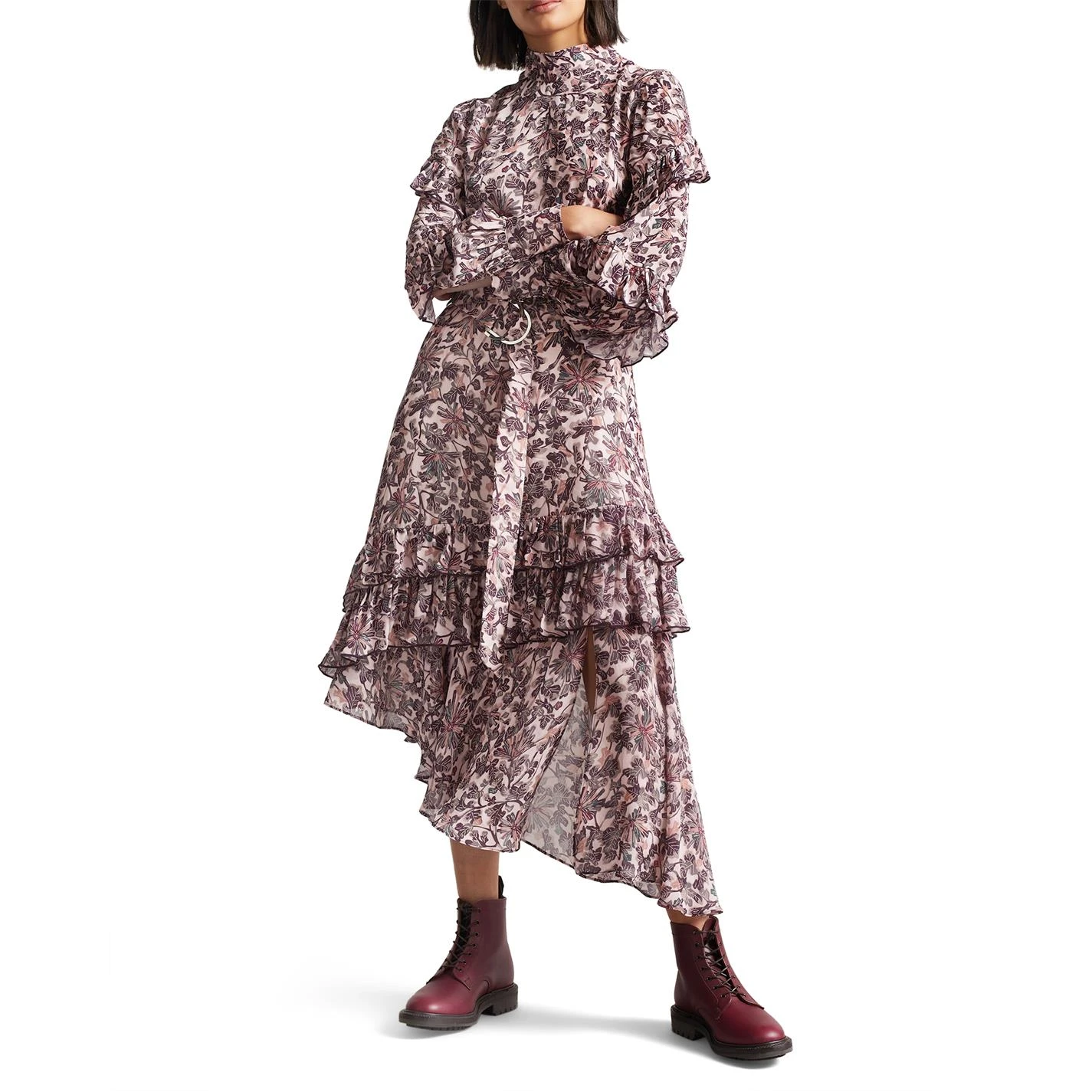 Designed with a feminine allure, the Alvvaa Foliage Print Layered Frilled Dress from Ted Baker has been crafted from a lightweight Viscose fabrication styling a foliage print all-over for a versatile summer-to-winter piece. Styling a raised collar, this midi length dress has an asymmetrical hem charactrised with a fringe detailing and long balloon for a modern twist. Complete with a belt to cinch your waist and a rear zip fastening, this dress is perfect to pair with a chunky pair of boots and leather jacket.