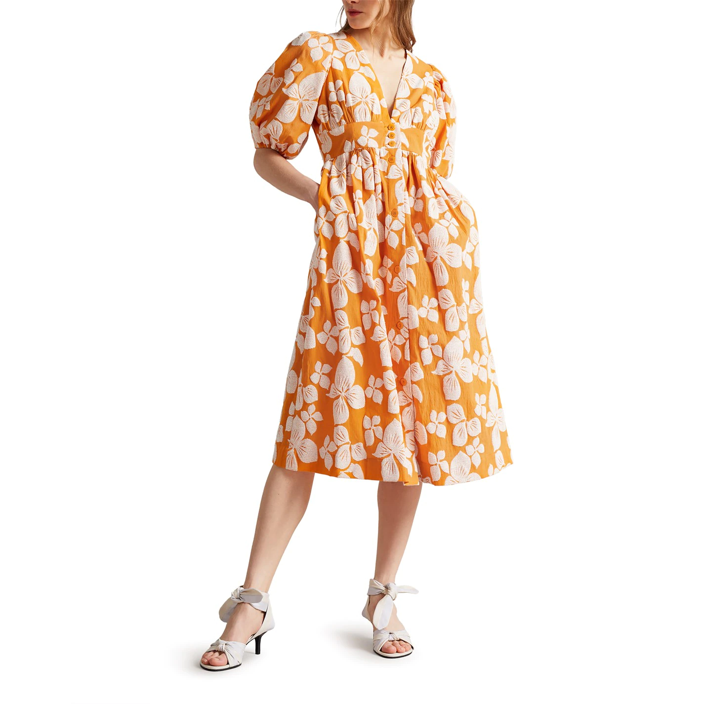 Hit refresh on your wardrobe this holiday season with the Ted Baker Cinthy Dress. Crafted from a cotton blend with a flattering v neckline and short puffed sleeves, the button detailing to the front offers a vintage touch. With the lightweight lining providing volume to the dress, the look is complete in an all-over print.