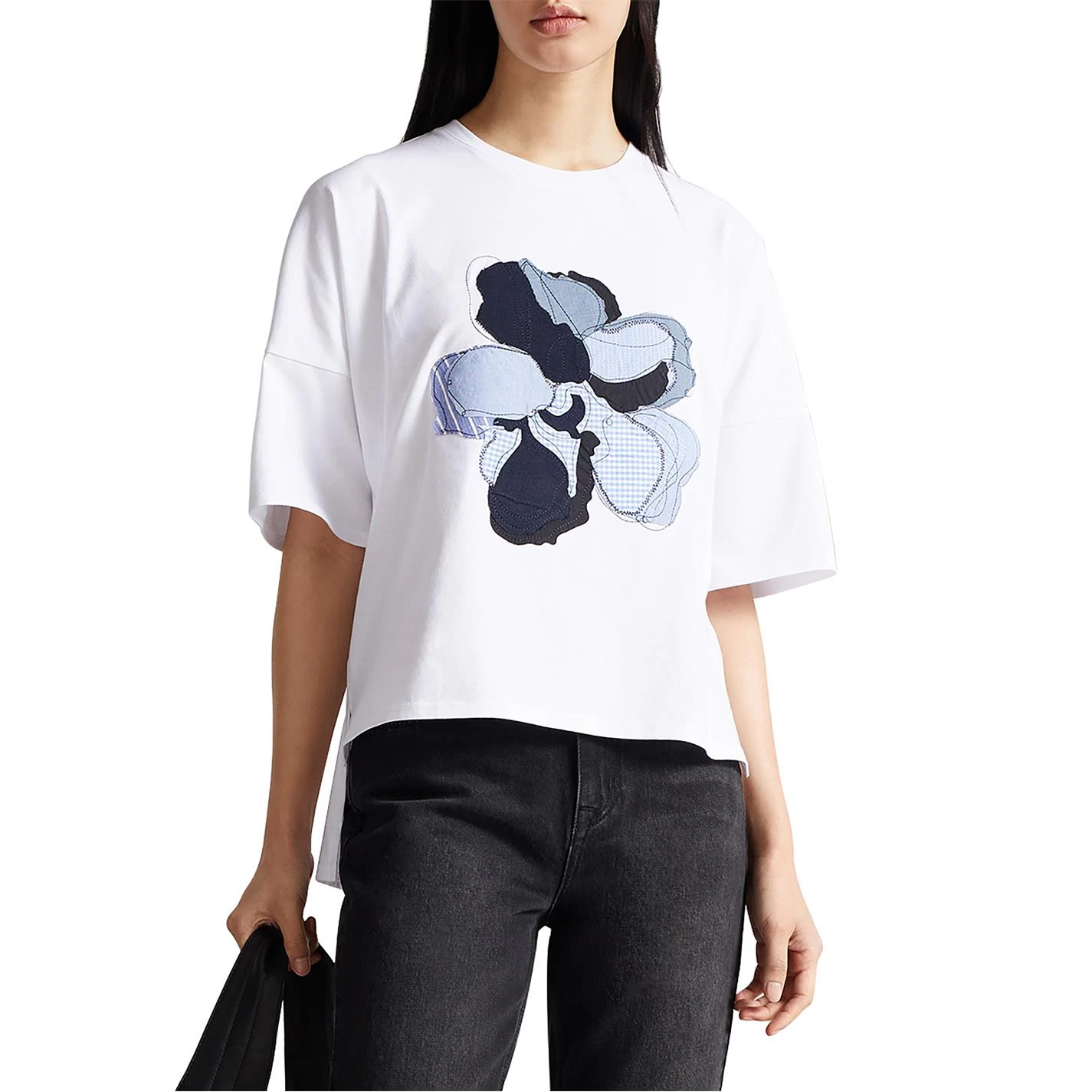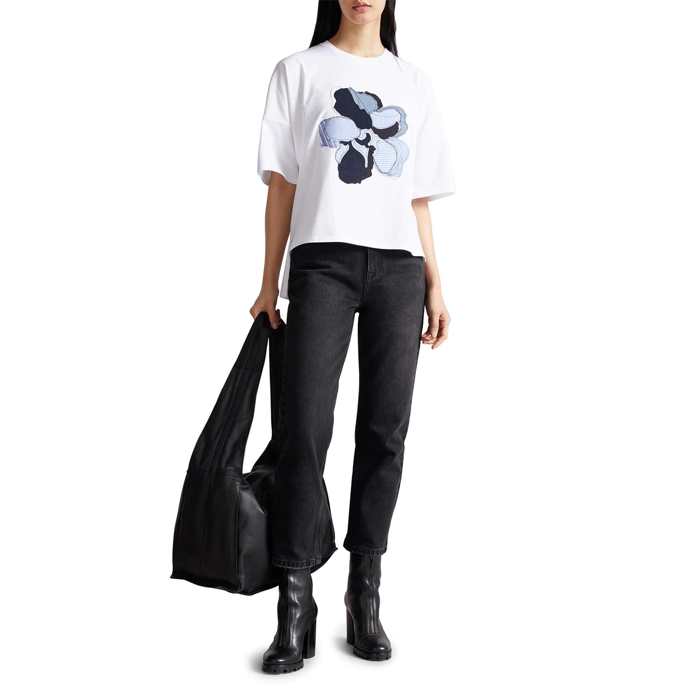 Elevate your everyday wardrobe with the Ted Baker Floriyn T-shirt. Cut from cotton with a crew neckline to help achieve a classic look, the dropped shoulders and asymmetric hem provides a contemporary aesthetic. With the solid block colouring making the piece extremely versatile, the floral motif to the front completes the look.