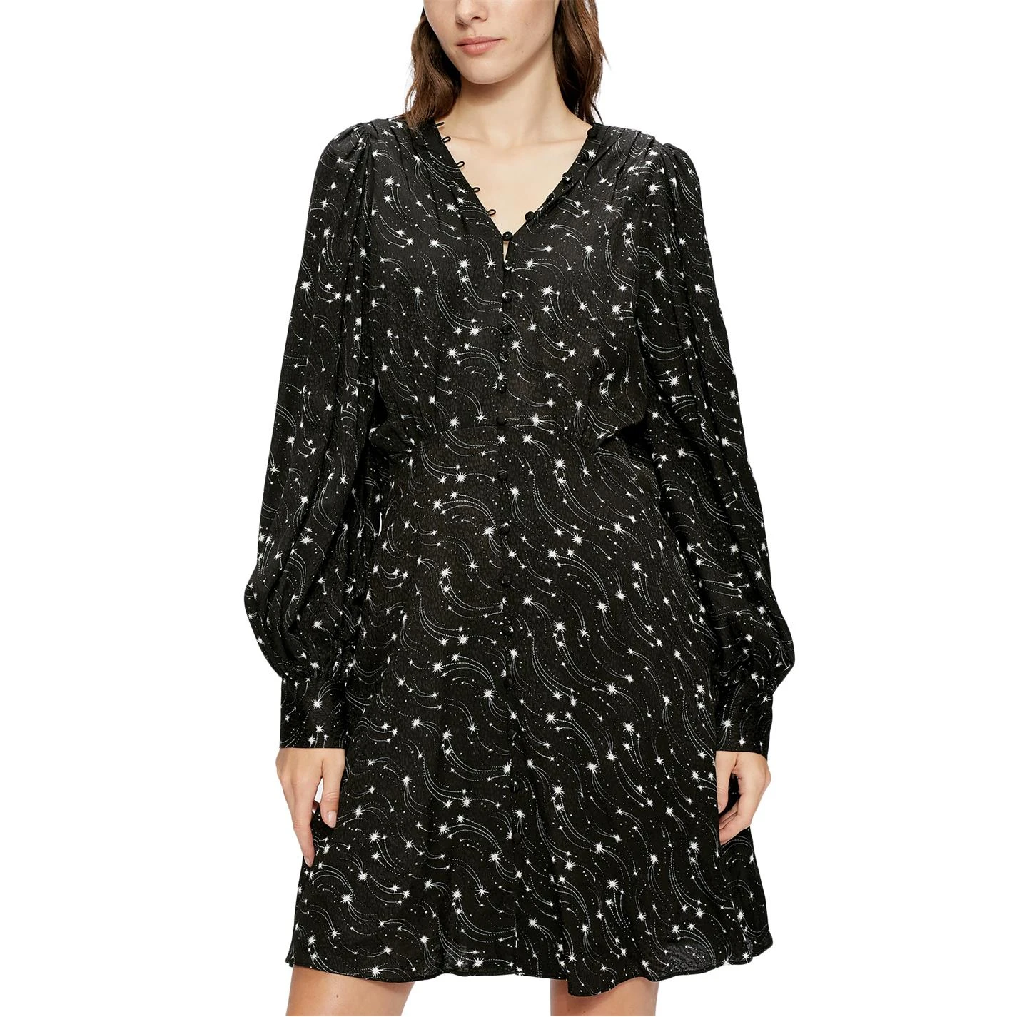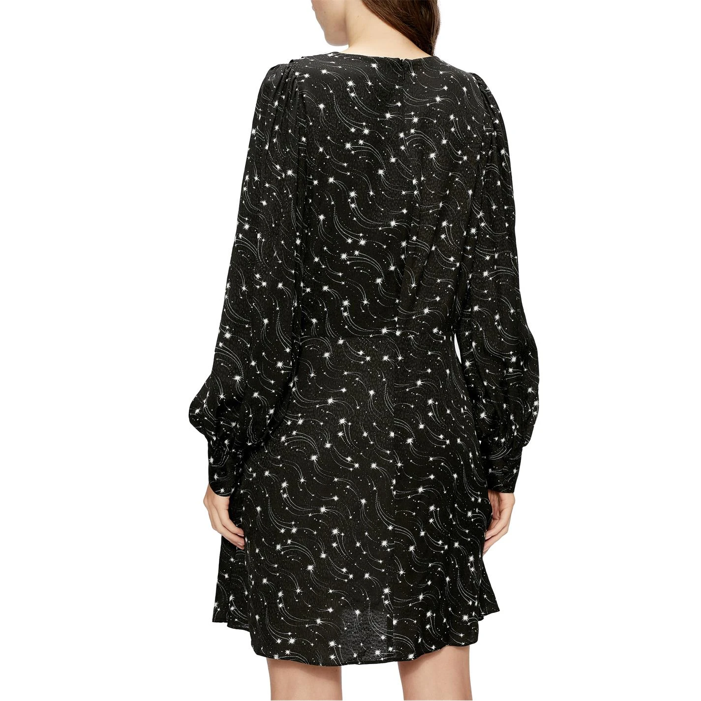 Perfect for the festive season, this iconic dress from Ted Baker has been designed with a magical all over print, styling a mini length cut, loop buttons, concealed zip fastening and blouson sleeves. Adorned with shooting stars and a monochromatic colour scheme, the dress features an optional v neckline and jacquard finish for high quality composition.