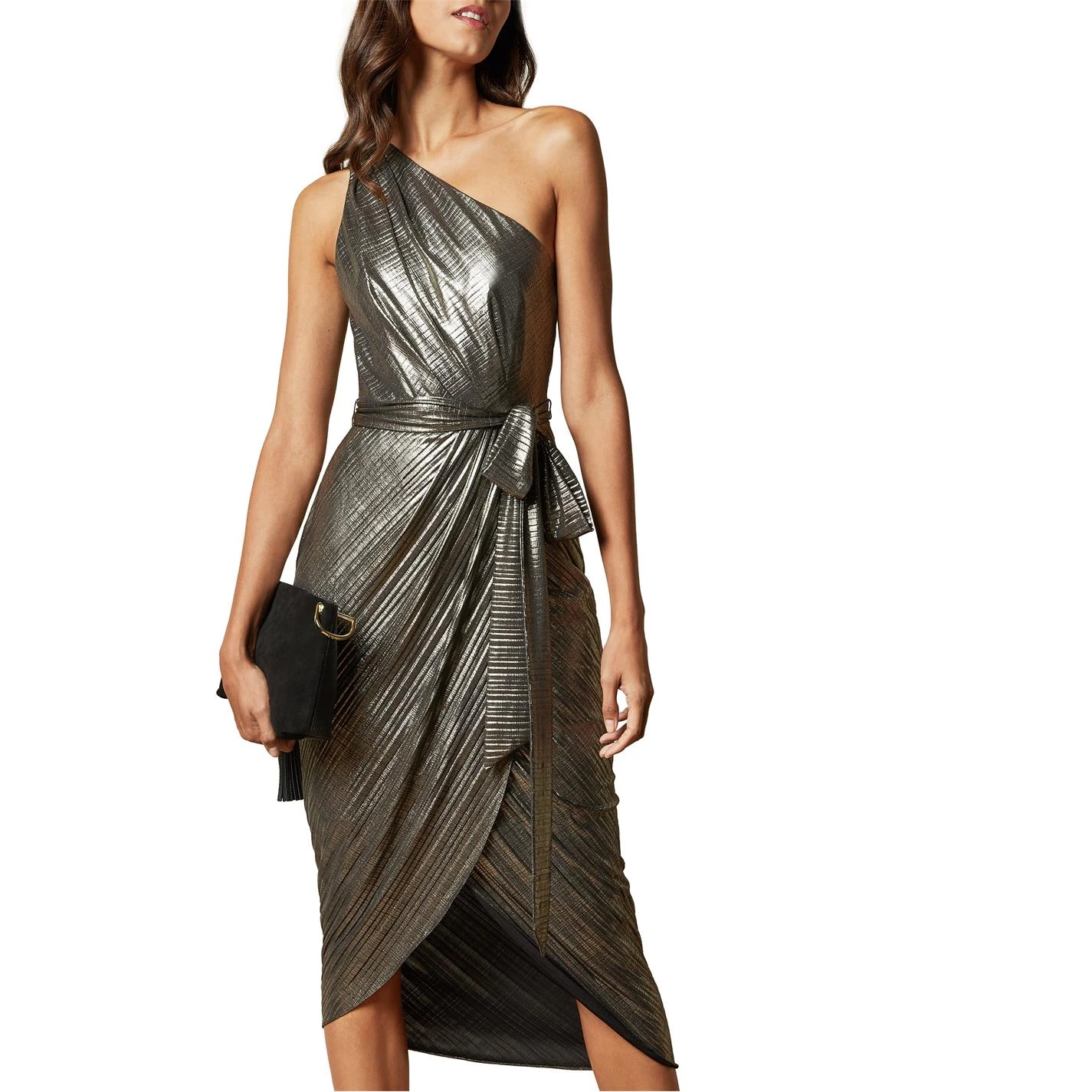 Make a statement in the Ted Baker Grbria Midi Dress. Designed in a wrap silhouette for a flattering fit, this stunning dress comes styling a waist tie fastening and one shoulder construction. With the metallic look providing a premium aesthetic, the midi dress is complete with Ted Baker branding for a high quality appeal.