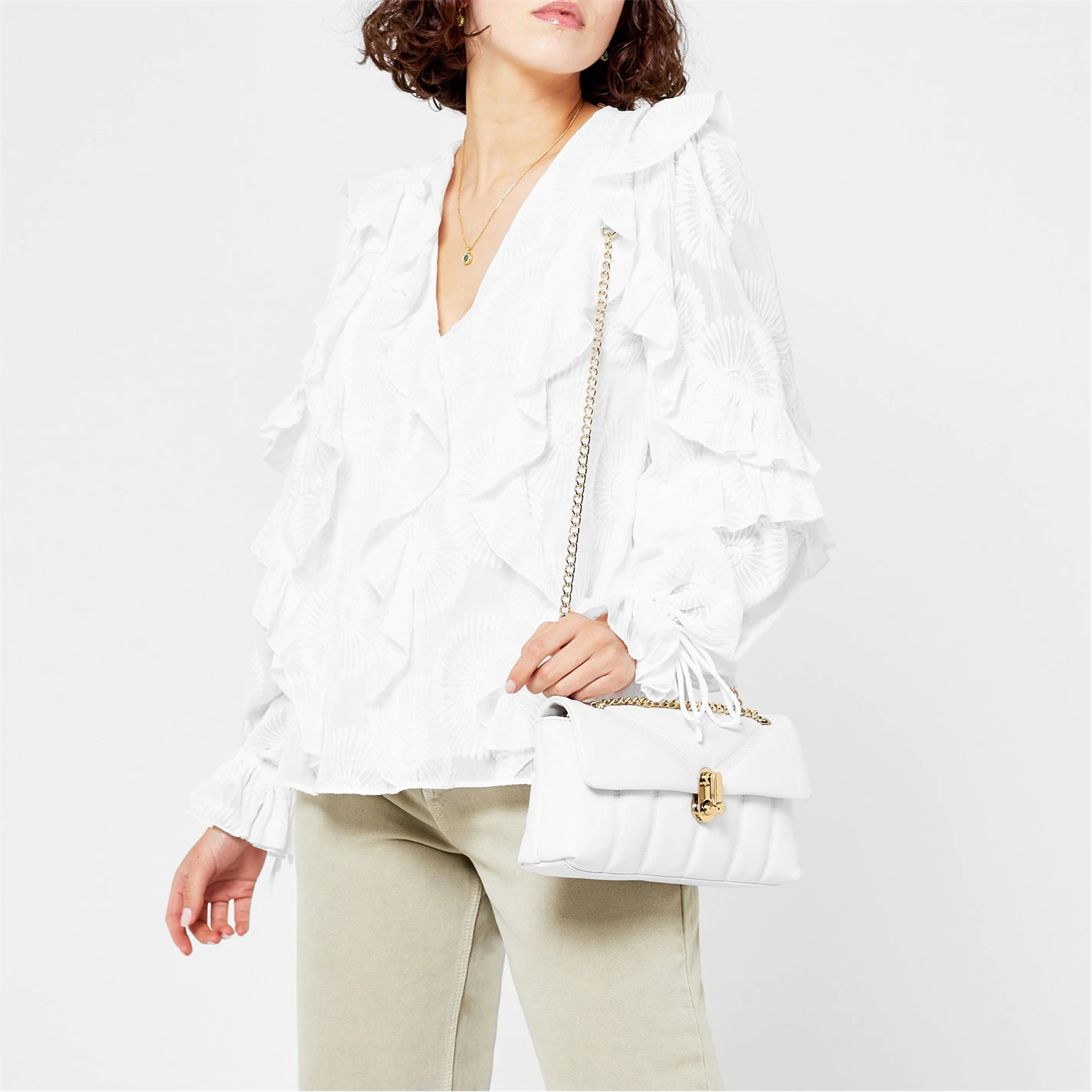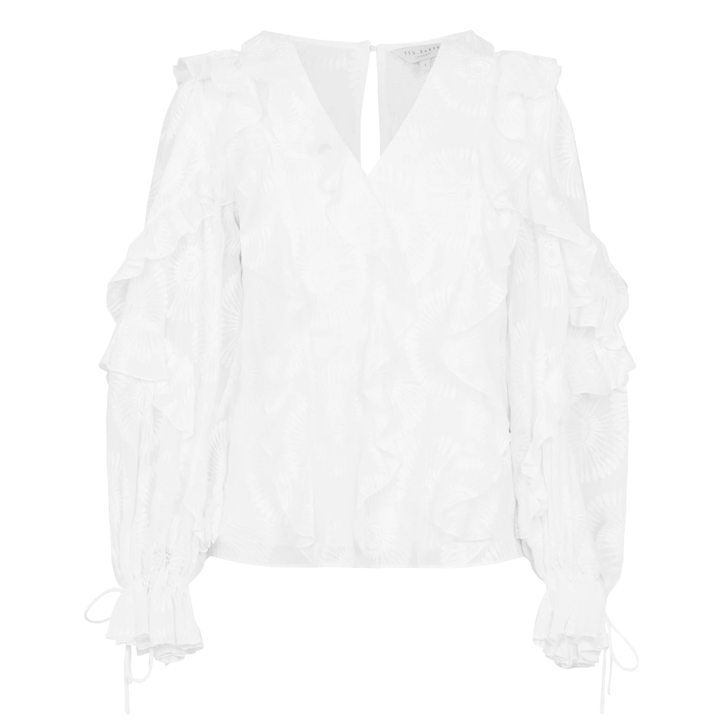 With a feminine allure, the Janeio Ruffle Top brought to you by Ted Baker has been crafted from from a lightweight Polyester fabrication boasting tonal embroidery throughout for a summer ready aesthetic. With double lining to the front and a sheer fabrication at the rear, this top styles a v-neckline, long sleeves with drawstring cuffs and ruffle details all-over. Pair yours with leather-look trousers and mules for any evening occasion.