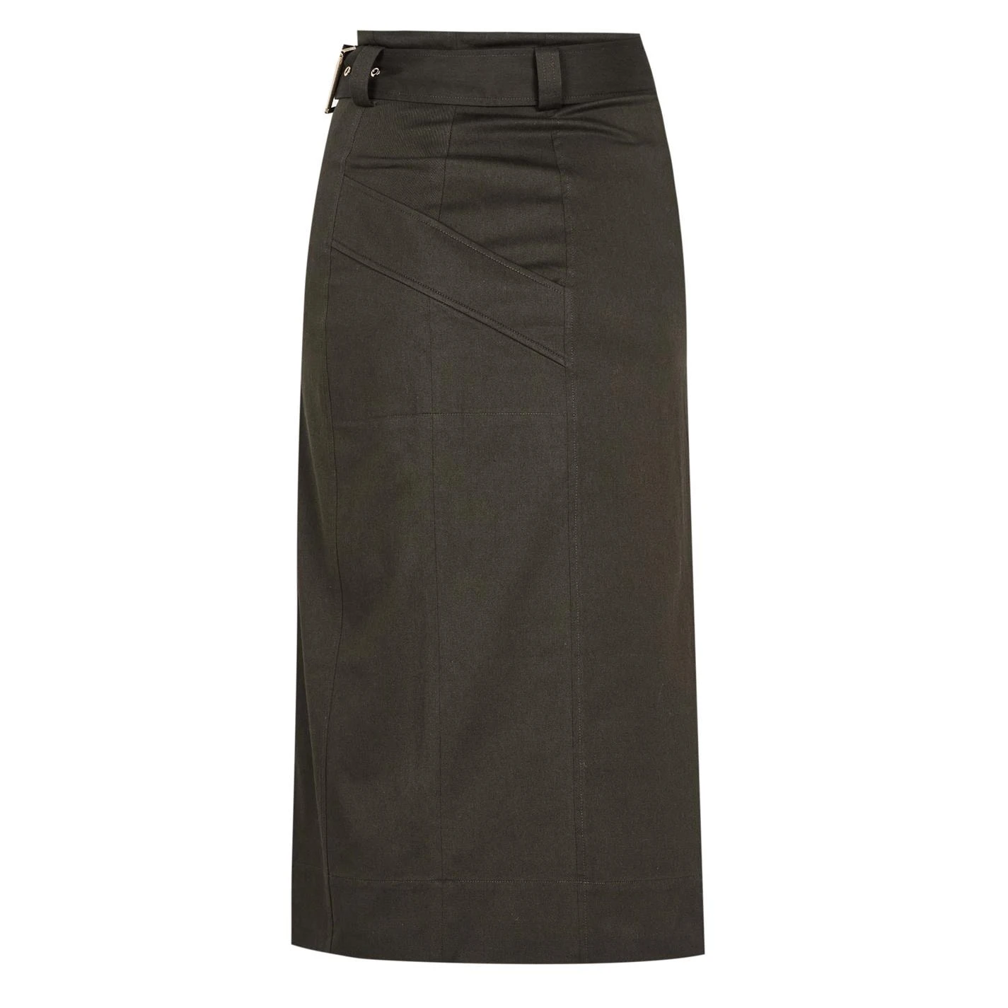 Elevate your weekend fit with the Ted Baker Janiis Midi Skirt. A structured cotton blend construction with a classy midi length and central zip fastening. The gold toned buckle fastening at the waist adds a trendy, high quality element with the side pockets completing the stylish piece.