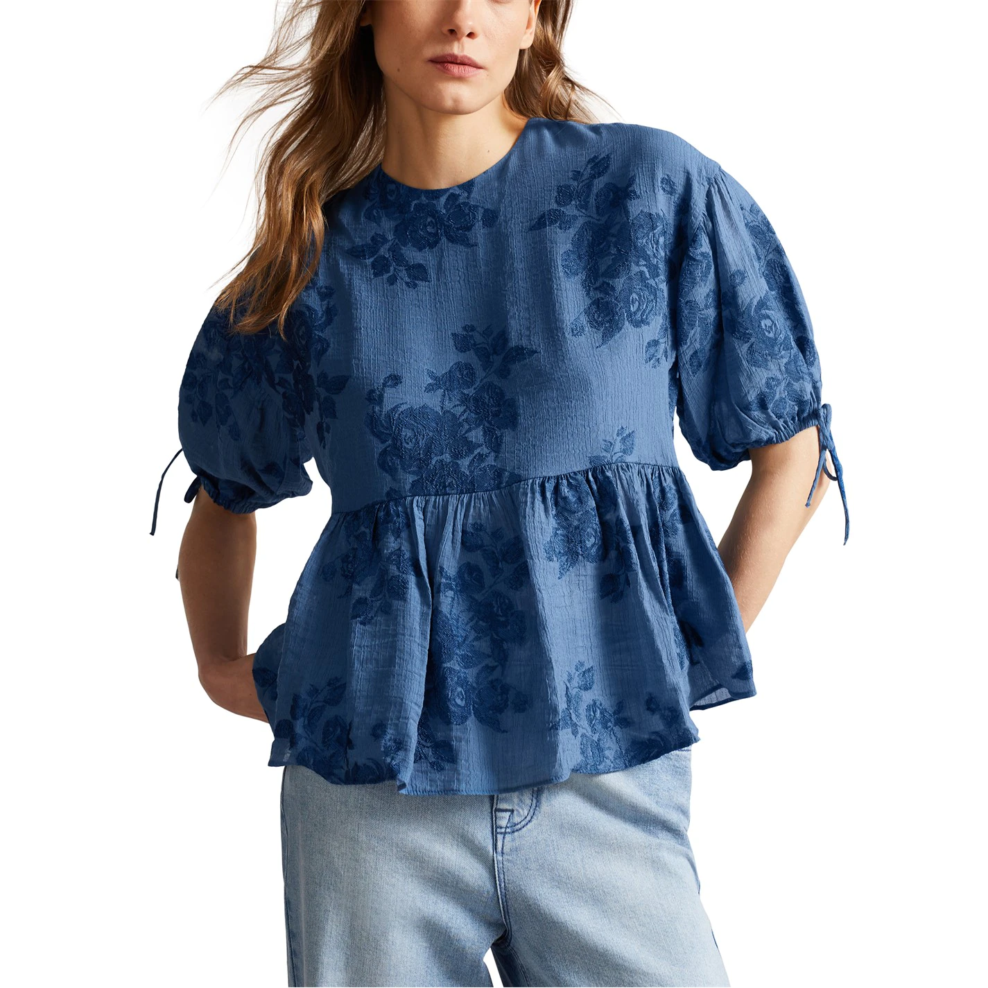 Refresh your casual wear with this Kaarin Blouse by Ted Baker, crafted in Turkey from viscose and polyamide blend for a super-lightweight design. Featuring a scoop neckline, elbow-length sleeves, elasticated, tie up cuffs and finished with gorgeous blue roses blossom on this sweet blouse, with a fluttery peplum hem and a delicate tie that crosses the open back.