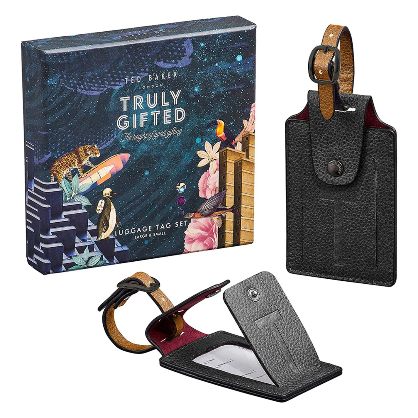 Travel in style with this Ted’s World Luggage Tag Set from Ted Baker. Contains two navy textured luggage tags, x1 large and x1 small. Packaged in ‘Truly Gifted’ Ted’s World illustrated gift box.