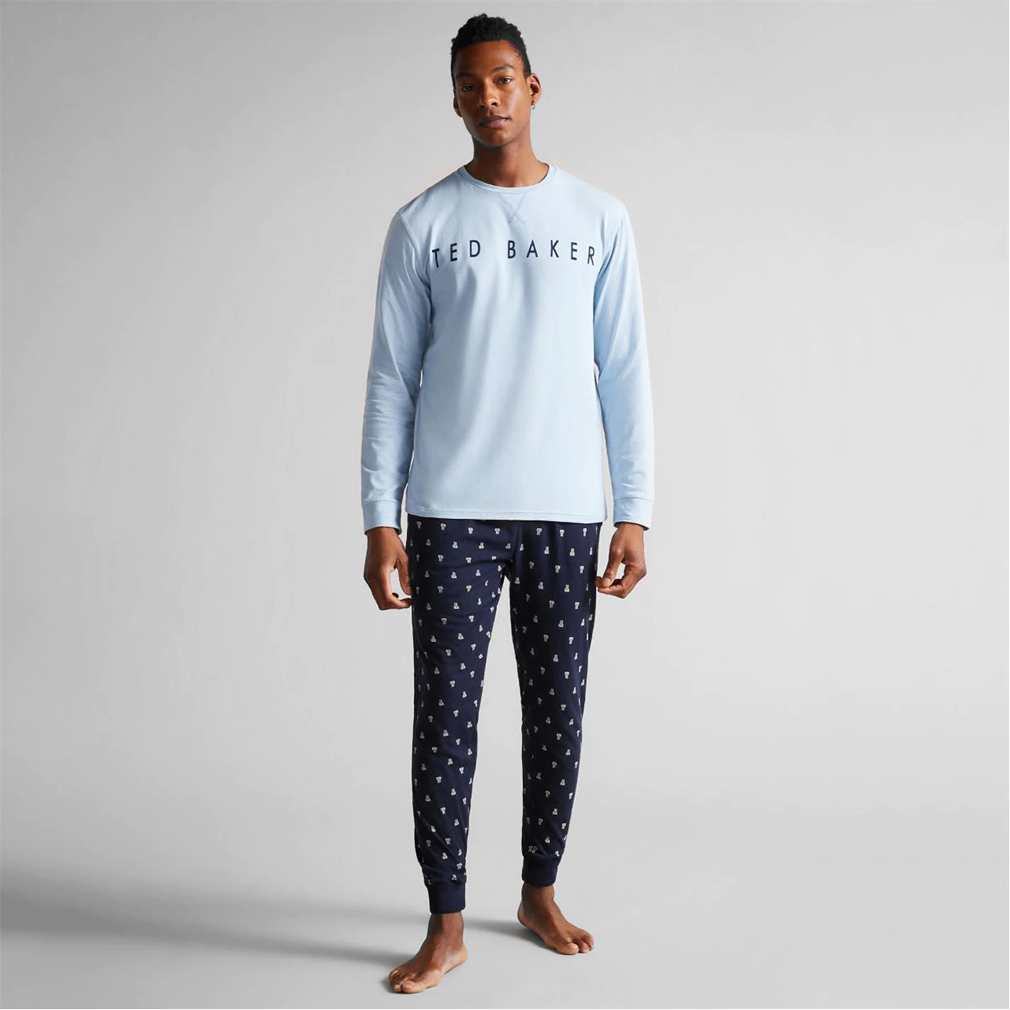 Treat a loved one with the Ted Baker Pyjama Box Gift Set. The set includes slim fit trousers with elasticated cuffs and two side slip pockets with the long sleeve top styling a rounded neckline and ribbed cuffs. With the all-over branding on the trousers offering a stylish aesthetic, the Ted Baker branding at the chest completes the high quality design.