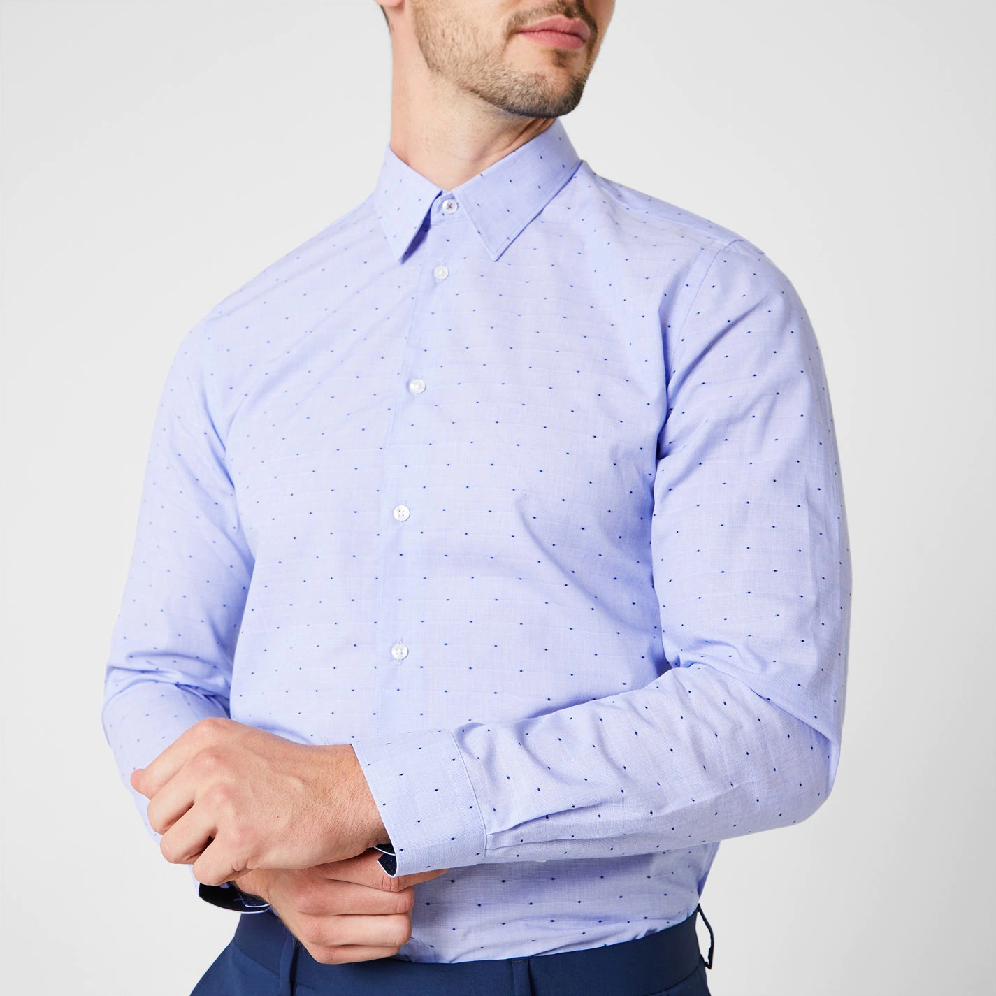 Perfect for weddings or any formal occasion, this slim fit silhouette has been crafted from a soft cotton fabrication styled with a blue colourway adorned with contrasting dots repeated throughout for a luxe appeal. Complete with a point collar, full button placket and button cuffs to the long sleeves, this shirt is perfect to layer under a blazer and pair with jeans for a toned down look.