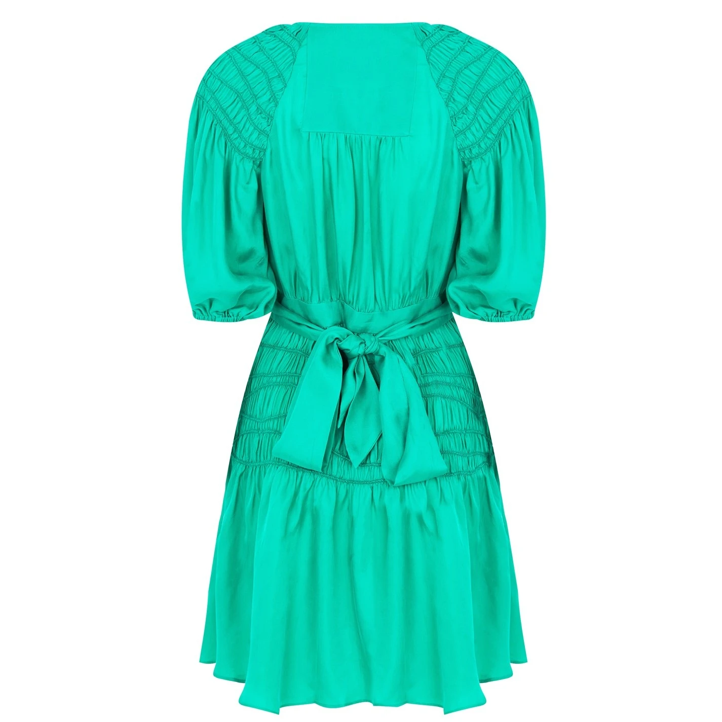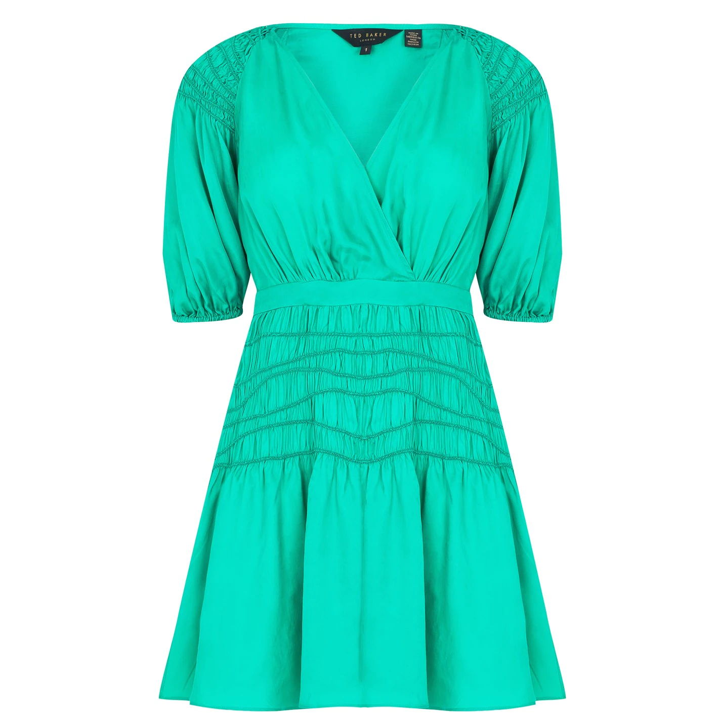 Liven up your wardrobe with the Ted Baker Taluna Dress. Cut in a mini length with a flattering v neckline and gathered waist, this dress comes styling short balloon sleeves for a vintage touch. With the tie detailing allowing a custom fit, the shirred panels and solid block colouring completes the look.