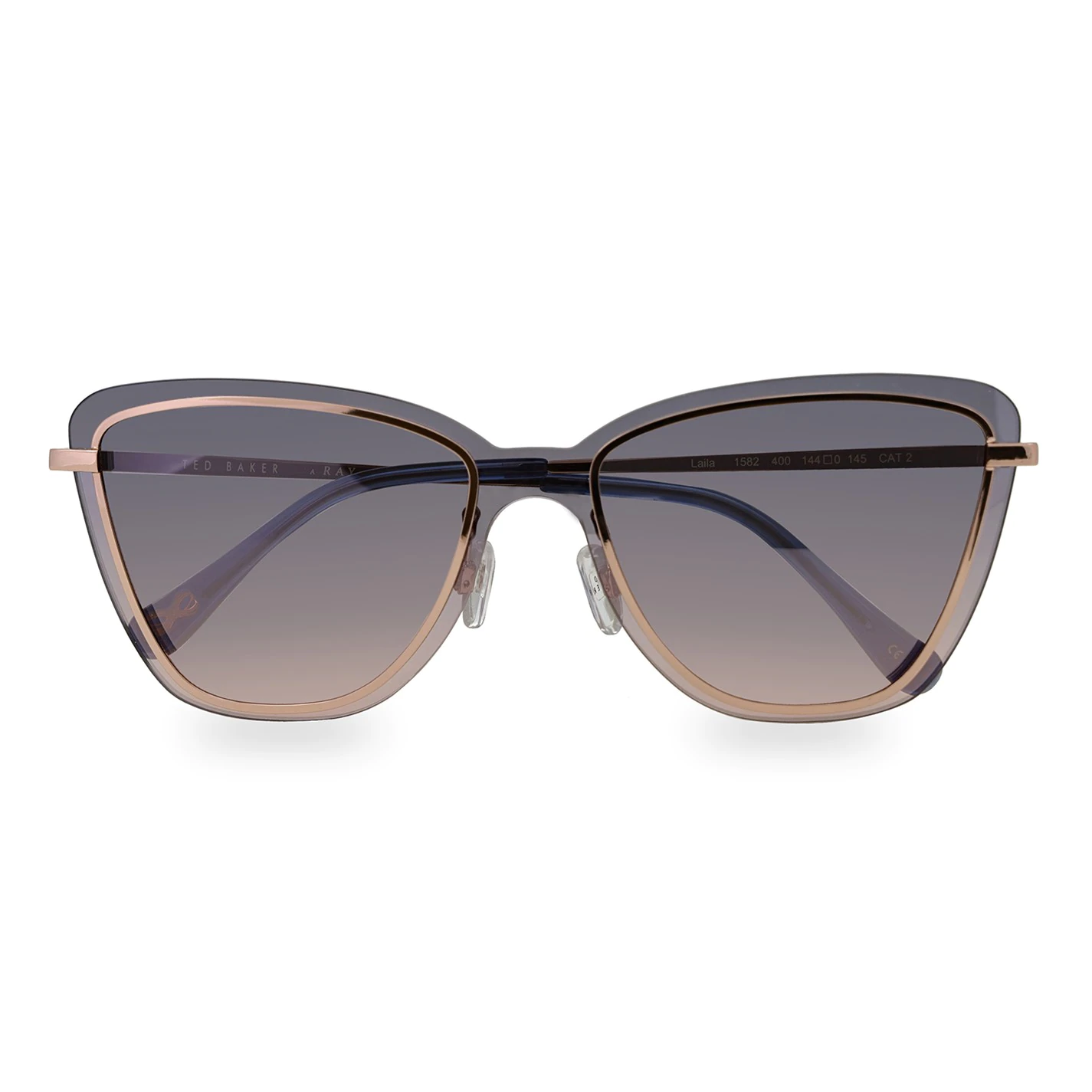 A fashion forward Ted Baker women’s sunglass with a rimless appearance. In rose gold metal with a beautiful blue to pink graduated lenses with a slight mirror