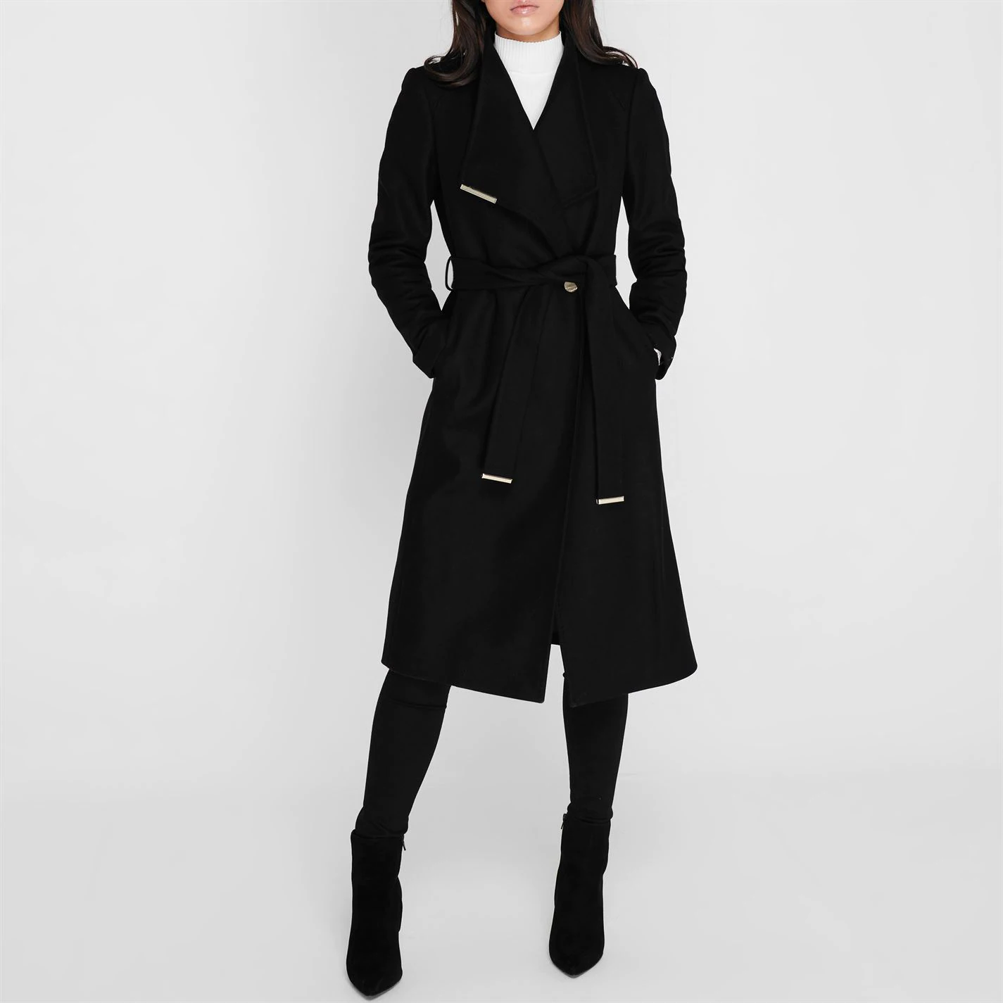 Ensure your wardrobe is prepared and invest in your coat collection with Rose from Ted Baker, keeping you looking sleek and stylish on the colder days and wintery months. Made from a high quality wool, the coat has been cut in a signature wrap style, and completed with elevated details such as the high neck collar and metallic tipping on the belt. Pull yourself in and create a flattering look with this simple yet statement layer.