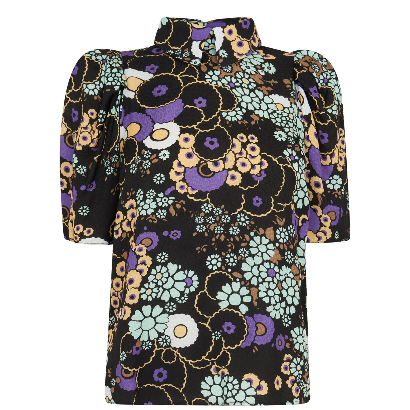 With it’s swinging sixties aesthetic the Yvonn Floral Top from Ted Baker is crafted from a super soft pure viscose construction, in a vibrant floral patterning that is sure to turn heads. In a short sleeve construction, exaggerated shoulders, classic collar and is complete with a keyhole back button fastening. Pair with a mini skirt and knee high boot to excel your vintage aesthetic.